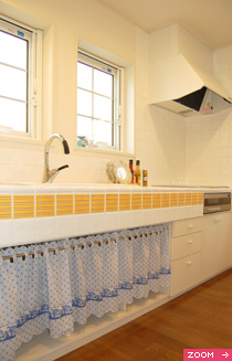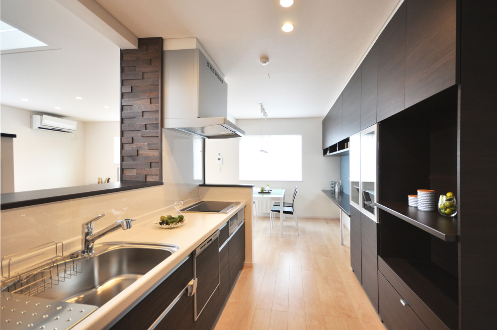 LDKはどこにいても家族の気配が感じられる一体空間。オープンなキッチンは両サイドから出入りができ、動線もスムーズ。キッチン前にはオリジナルの収納もあり、収納力抜群です。一旦リビングに入って2階に上がっていくので、お子さんの帰宅もすぐわかります。